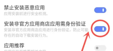 4、在应用安装设置页,打开"安装非官方应用商店应用需身份验证"开关,即可禁止软件自动下载安装。