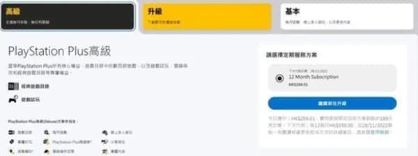 3、3档“高级”:额外可下载游玩PS1/PS2/PSP游戏及部分大作限时试玩(PSN HK商店暂不支持PS3云游戏),1个月/85HKD、3个月/239HKD、12个月/599HKD。