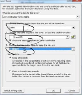 2、然后点击“Join Data”页面,如下图,分别选择属性表连接字段,excel表所在的sheet,excel表中连接字段,完成点击“OK”即可。