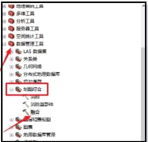 3、也可以在工具箱打开,找到“数据管理工具”下的“制图综合”打开,即可找到“融合”。