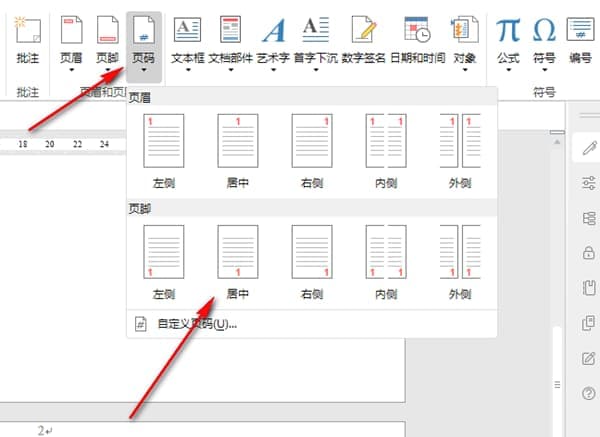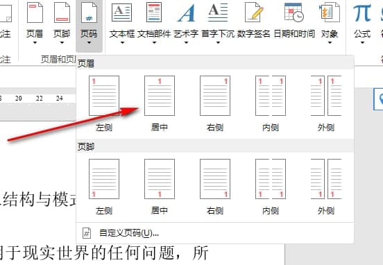 5、同样地,插入"页脚"时也可以进行相同操作,显示底部的页码。