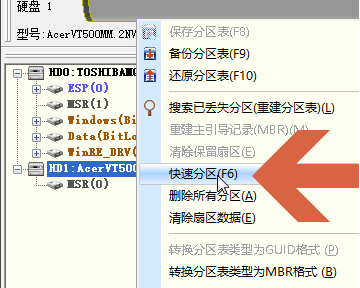 2、在右键菜单中选择“快速分区”。