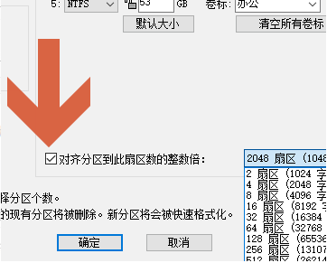 4、对于固态硬盘,勾选“对齐到此扇区的整数倍”选项,并设置合适的扇区数值。