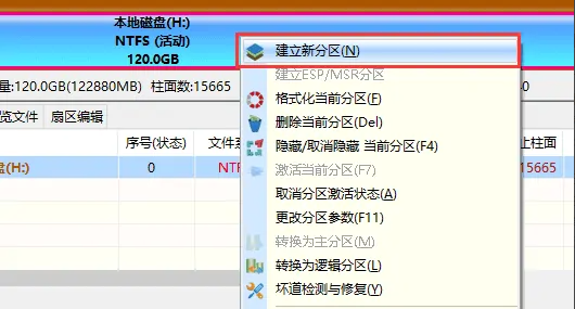 3、选中目标分区,右键点击并选择"建立新分区"。
