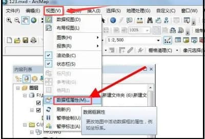 arcgis经纬网设置方法1、首先在打开界面找到“视图”按钮点击下拉菜单中的“数据框属性”选项。
