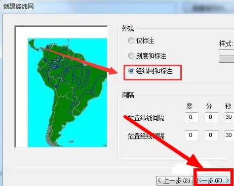 4、接着在“创建经纬网”页面右侧外观下,勾选上“经纬网和标注”,然后点击“下一步”保存即可。