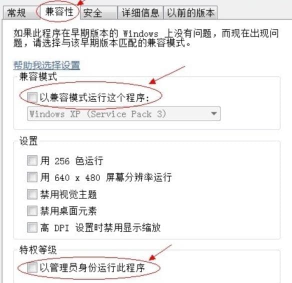 3、将兼容性下面的“以兼容模式运行这个程序”和“以管理员身份运行此程序”进行勾选。