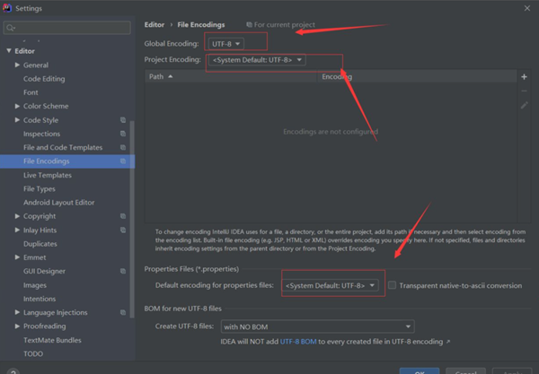 2、上方导航栏“File→Settings…”进入配置页面,在“Editor”中下滑找到“File Encodings”,分别将 Global Encoding、Project Encoding、Default encoding for properties files 都设置为 UTF-8。在重启之后运行程序检查控制台信息。