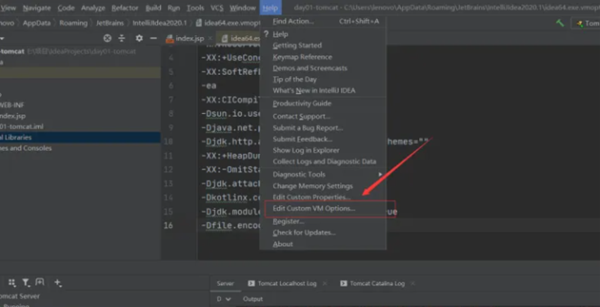 3、上方导航栏“Help→Etit Custom VM Options”进入自定义虚拟机选项页面。