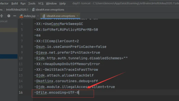 4、在 idea64.exe.vmoptions 文件尾加上-Dfile.encoding=UTF-8。在重启之后运行程序检查控制台信息。