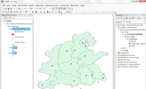 arcgis拓扑检查的方法1、首先打开创建好的拓扑数据集到ArcMap中,红点是拓扑错误的位置。