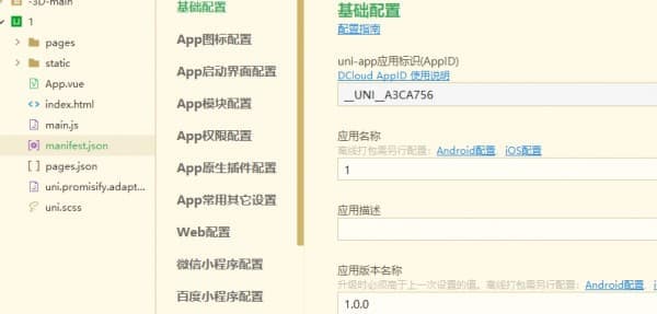 3、在项目根目录下,找到manifest.json文件。根据您的需要,配置应用程序的名称、图标、权限等信息。
