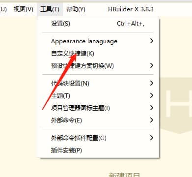 2、如果您希望自定义快捷键,可以按照以下步骤进行操作:(1)打开HBuilder,点击菜单栏中的“工具”选项,选择“自定义快捷键”。