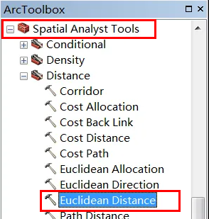 不清楚arcgis欧式距离怎么用的小伙伴。首先将数据加载到ArcMap中,然后打开ArcToolbox工具箱,选择Spatial Analyst Tools,下拉内容点击Euclidean Distance功能,详情如下。