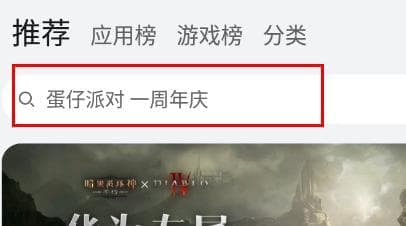 华为应用商店蛋仔派对下载教程:1、首先我们找到上方的搜索框。