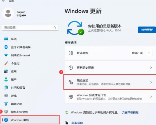 2、设置窗口,左侧边栏点击【Windows 更新】,右侧边栏点击【高级选项(传递优化、可选更新、活跃时间以及其他更新设置)】。