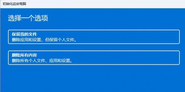 5、初始化这台电脑,大家可以根据自己的情况选择,是【保留我的文件(删除应用和设置,但保留个人文件)】,还是【删除所有内容(删除所有个人文件、应用和设置)】。