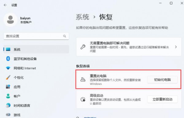 4、当前路径为:系统 》 恢复,点击恢复选项下的【重置此电脑,选择保留或删除个人文件,然后重新安装Windows旁的[初始化电脑]】。