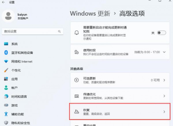 3、当前路径为:Windows 更新 >高级选项,然后点击其他选项下的【恢复(重置、高级启动、返回)】。
