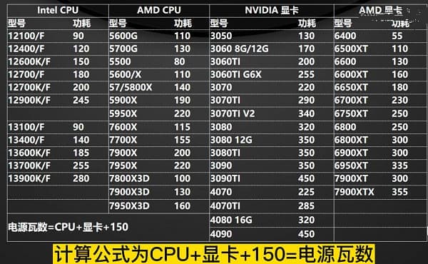 例如i5 8400是65W的功耗,GTX1066显卡是120W功耗,把所有配件的功耗加起来再加100W就是你需要的电源额定功耗