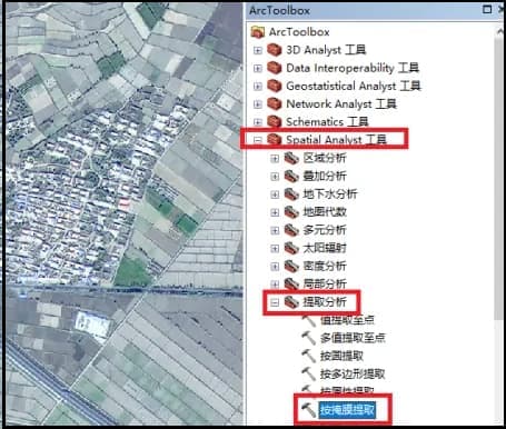 2、接着打开“Arctoolbox”工具箱,找到“Spatial Analyst”工具,然后点击下拉内容“提取分析”功能“接着点击“按掩膜提取”。