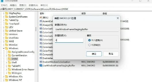 3、新建一个名为 UseWindowFrameStagingBuffer 的 DWORD(32 位)值 ,并将其十六进制值设置为0。