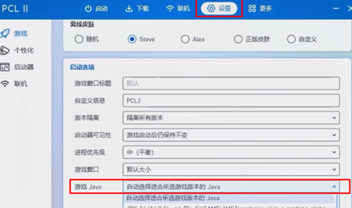 6、然后在“设置”界面找到“游戏Java”,选择“自动选择适合所选游戏版本的Java”即可。