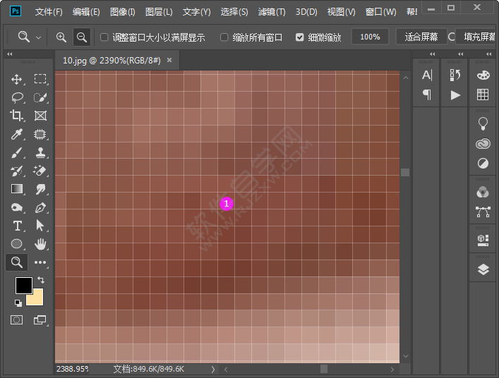 打图像,如左下图所示,使用“缩放工具”在人特彩色眼角部分不停地单击,放大数倍后,眼角效果如下图,由此可见在整张图中,单位面积内所包括的像素越多,就越能表现出图片细微的部分,照片也就越清晰,反之就越模糊。