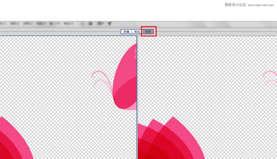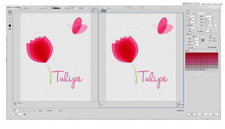 你可以通过三种方式浏览你的作品。最左边的“原稿”可以简单地展示原稿效果,但由于你是要预览被优化后的效果,因此这个选项几乎没有作用。你也可以来到“优化”这个选项,在这里可以预览到优化后的效果,或者你还可以选择“双联”,这个选项会让你将原稿和优化后的作品左右对比进行预览。在下图中,左边的是原稿,右边是优化后的效果(在本例中,是作为GIF格式进行优化的)。