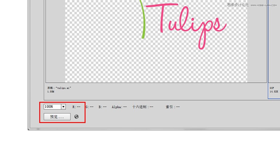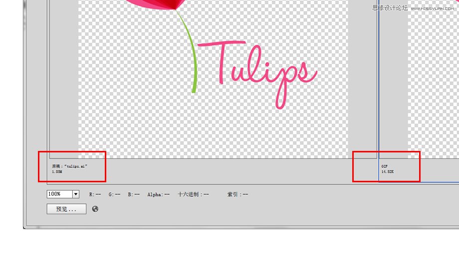 保存为WEB格式的界面中最为重要的部分就是图片大小,在每个预览图的下方都会出现这个图片的文件类型和大小。在下图中可以看到,我们的左边的原稿是ai格式,文件大小是1.85M,而右边优化后为GIF格式,文件大小变为了14.53K。既然是要在文件大小和品质之间找到最佳平衡,因此你需要时刻保持对文件大小的关注。