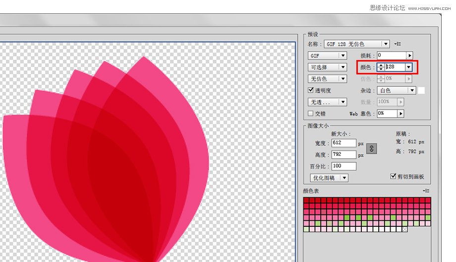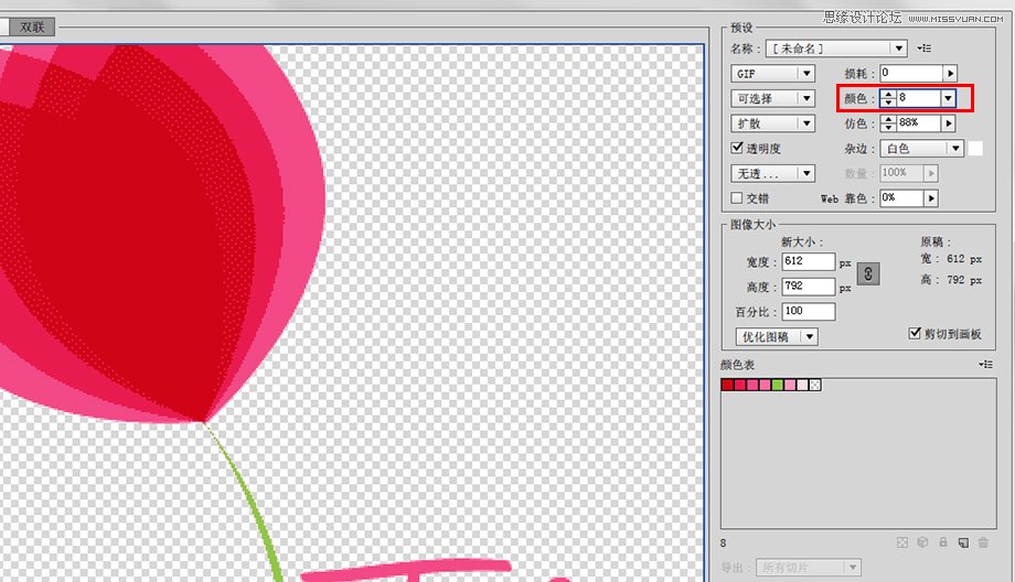 接下来让我们试着调低一下颜色的值,把颜色值设置为8,这时你会看到图片的大小变为了8.702K,但是图片丢失了品质。边缘开始出现锯齿,这时因为没有足够的颜色来支持颜色间的平滑过渡。虽然,我们在AI中只用了很少量的颜色,但AI本身的抗锯齿处理会使用更多的色彩来平滑边缘的锯齿。