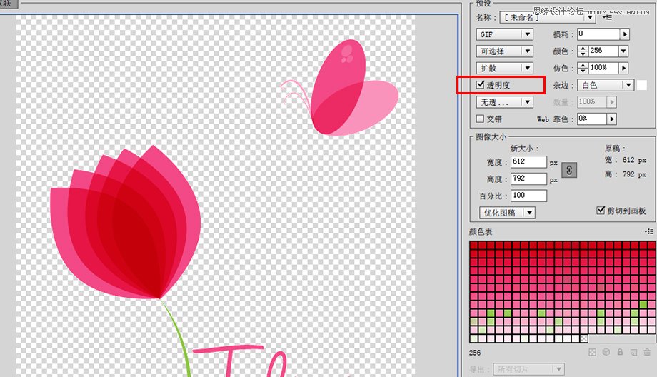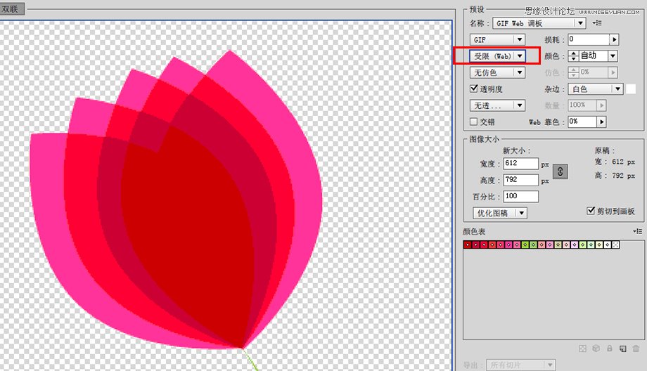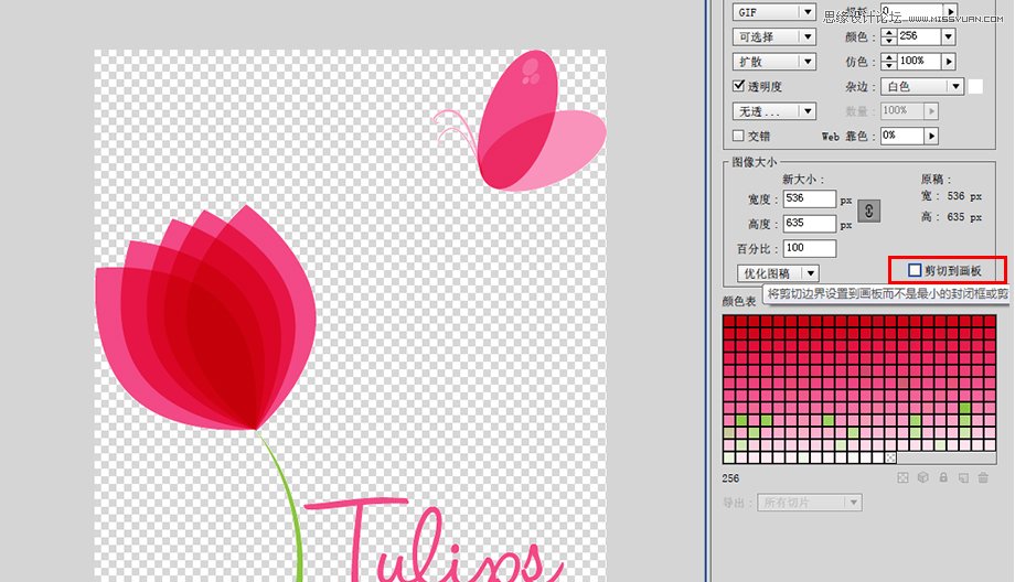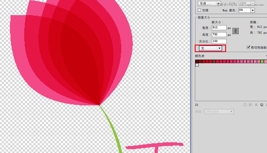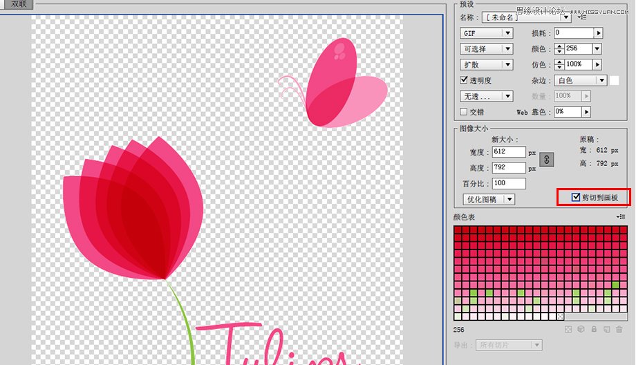 和GIF以及PNG-8一样,你可以选择图片的优化办法或者选择是否剪切图片到画板,你还可以具体设置图片的尺寸大小。但JEPG没有颜色表,因为JEPG是用的RGB的颜色模式,而不是索引颜色模式。