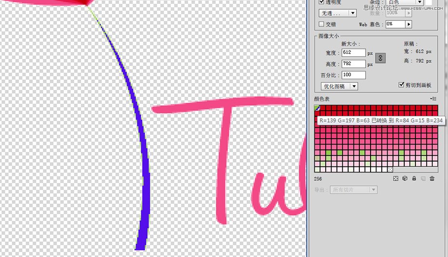 让我们继续看看右下方的颜色表,这个颜色表里包含了优化后的图片里所包含的每种颜色。其实,你完全可以通过双击修改某个颜色。就像我在本例中将绿色换成了紫色,而当你鼠标划过这个色块时,会有一行小字来提示你将什么颜色替换为了什么颜色。这种方式可以让你将一个作品保存为多种色彩的版本,而不用改变原始图片。