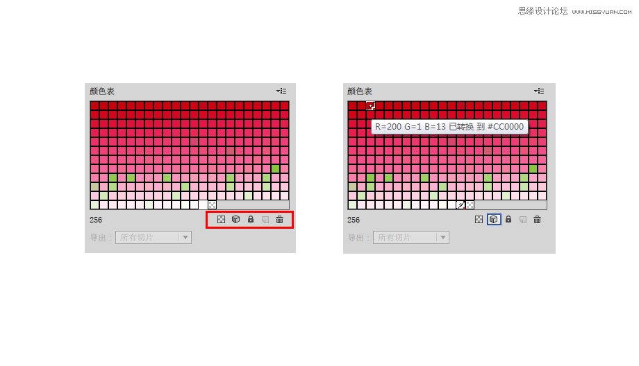 在颜色表的右下方有一排图标,这一排图标让你可以更多地对颜色进行调整。你首先需要选中某一个色板,然后进一步可以设置其为网页安全色,或者锁定或者删除它。色板中出现星号就表示已经转为网页安全色,当鼠标滑过会提示出所替换的网页安全色的色值。