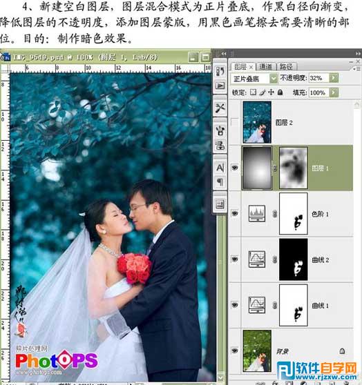 | 4、新建一个图层,图层混合模式改为“正片叠底”,选择渐变工具做黑白径向渐变,降低图层的不透明度,加上图层蒙版,用黑色画笔擦出需要清晰的部位。 |
