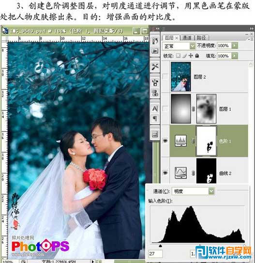 | 3、创建色阶调整图层,对明度通道进行调节,用黑色画笔在蒙版处把人物皮肤擦出来。 |