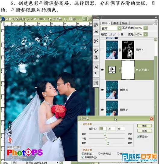 | 6、创建色彩平衡调整图层,选择阴影,分别调节各滑块,平衡整张照片的颜色。 |