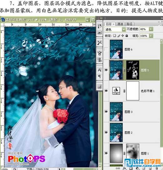 | 7、新建一个图层盖印图层,把图层混合模式改为“滤色”,降低图层不透明度,按住Alt键加上图层蒙版,用白色画笔涂抹需要突出的地方。 |
