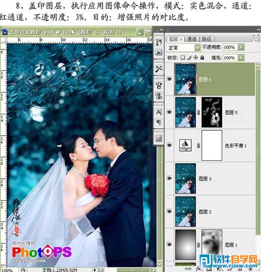 | 8、新建一个图层盖印图层,选择菜单:图像 > 应用图像,模式:实色混合,通道:红通道,不透明度:3%。 |