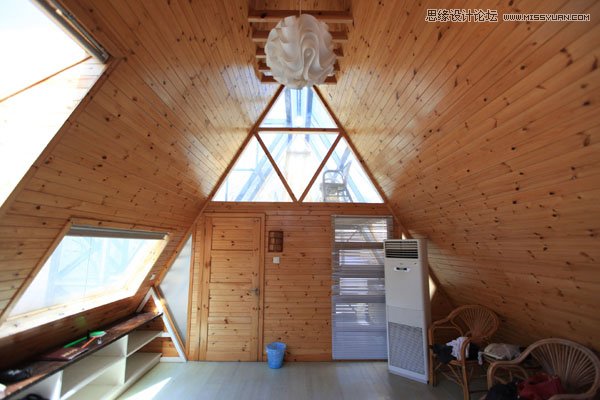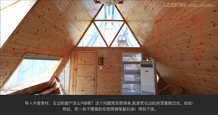 2、导入木屋素材,左边的窗户怎么P掉呢?这个问题其实很简单,就是把右边的房顶复制过去。然后把一些不需要的东西用钢笔都扫掉。