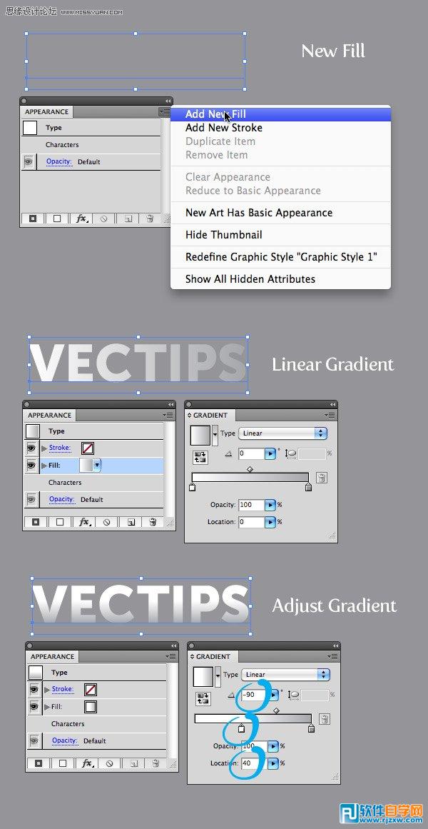 3.选择文本,从外观面板的下拉式菜单中选择“添加新填色”。新填色应用线性渐变,第1个色块:白,第2个浅灰。渐变面板里,更改第1个白色块位置:40,更改角度:-90。