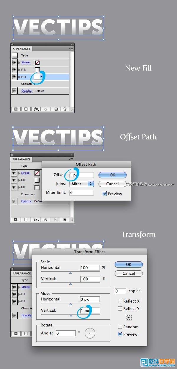 4.打开外观面板,象之前一样添加一个新填色,填色:白,确认白色填充在第1个渐变之下。选择白填色,执行“效果”菜单>路径>位移路径。在位移路径对话框中,位移:1px。白填色仍是选中状态,执行“效果”菜单>扭曲和变换>变换。在变换效果对话框中,垂直移动:1px。