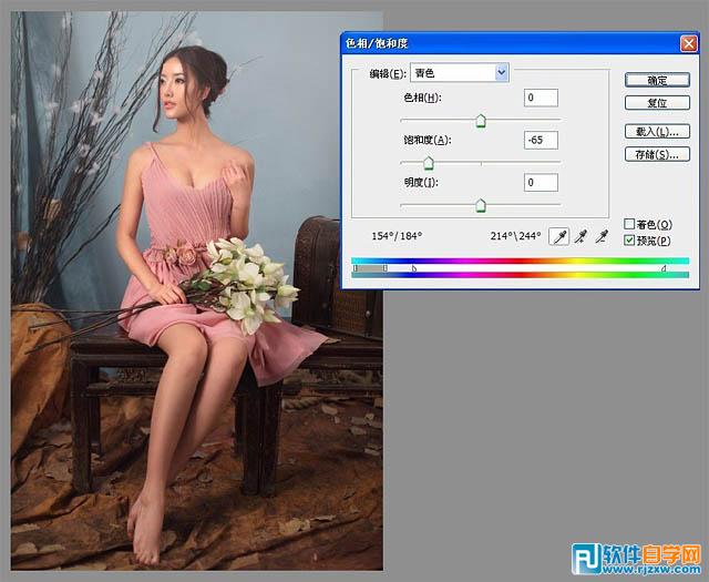 | 1、首先针对画面背景过于抢眼的青色进行调整,打开"色相/饱和度"工具,选择"青色",调整饱和度为-65,这样可以避免背景颜色过于突出,影响主体人物。 |