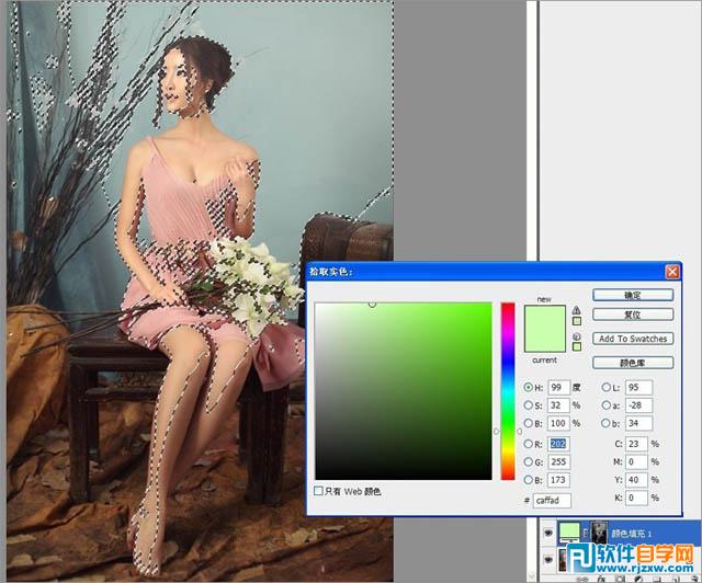 | 2、打开"选择/色彩范围",选取高光部分,添加"颜色填充"图层,选择一个淡绿色,参数见下图,用绿色给高光部位进行填充,然后将图层混合模式调整为"线性减淡",调整图层不透明为33%,让景与人融合的更加自然。 |