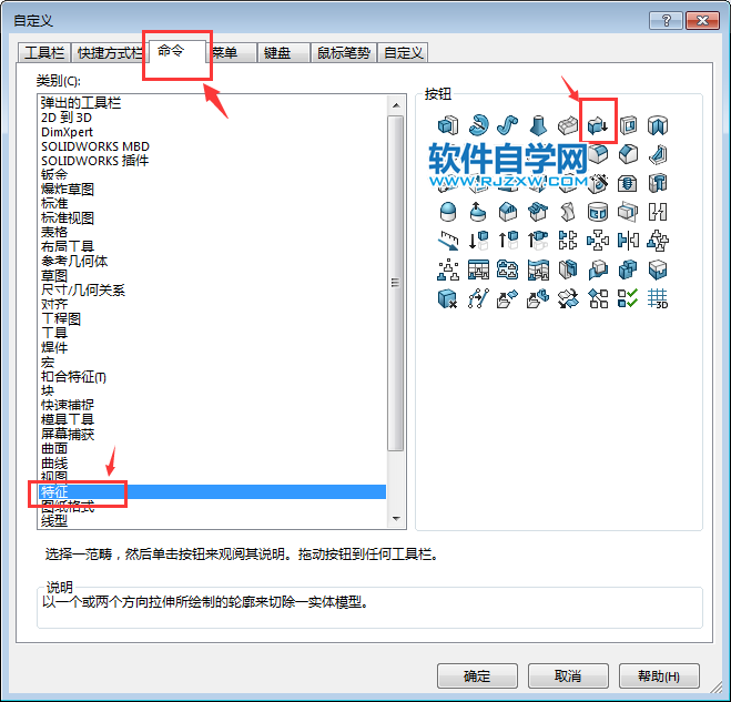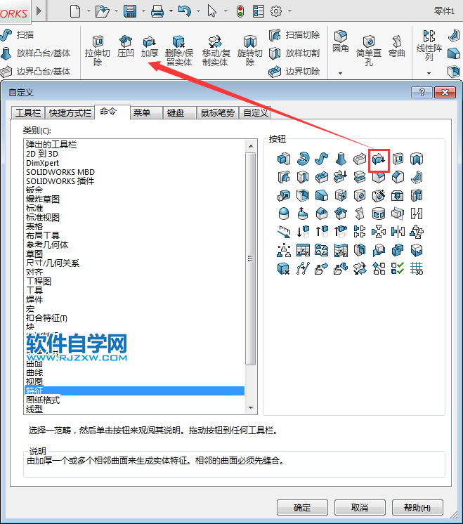 3、进入自定义对话框,点击命令,点击特征,就可以看到加厚按钮了。