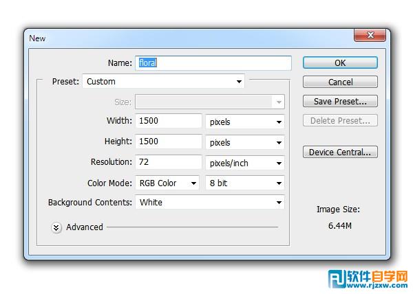| 一、添加背景 1、创建一个新的1500 * 1500像素在Photoshop中使用以下设置文档:(因为我们图片像素低1000*1000就够了) |