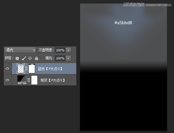 用圆角柔边画笔,设置颜色为#a5bbd8,画出如下图中的淡蓝色,更改图层混合模式为“柔光”。