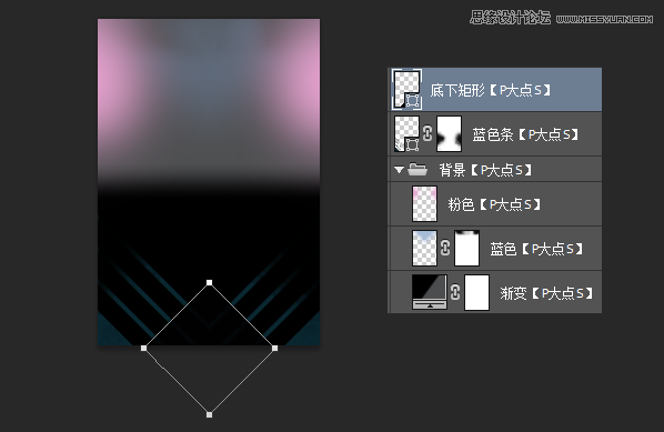 下面,我们来做原图下方的三角形和矩形。设置前景色为#0b2730,用多边形工具画那个三角形,用矩形工具画个矩形,旋转45度,排列成下图形状。