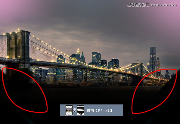 把我们提供的城市素材放进来,原图是黑白的城市,我这里用了一个类似夜景。创建一个蒙版,融合,需要注意的是左右两侧下方,下图红色圆圈标示的位置,原图是45度的,不是渐隐。
