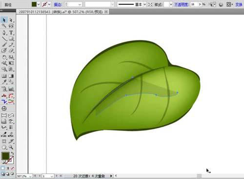 第3步、继续在绿叶的表面画出它的茎杆路径,我们用深绿色填充,画出绿叶表面的暗区,我们用正片叠底的绿色来填充并设置成透明度为40%左右。